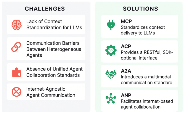 이처럼 MCP → ACP → A2A → ANP로 이어지는 네 단계는 컨텍스트 표준화, 멀티모달 메시지, 기업형 작업 위임, 탈중앙 네트워크라는 서로 다른 난이도와 범위를 순차적으로 해결합니다.